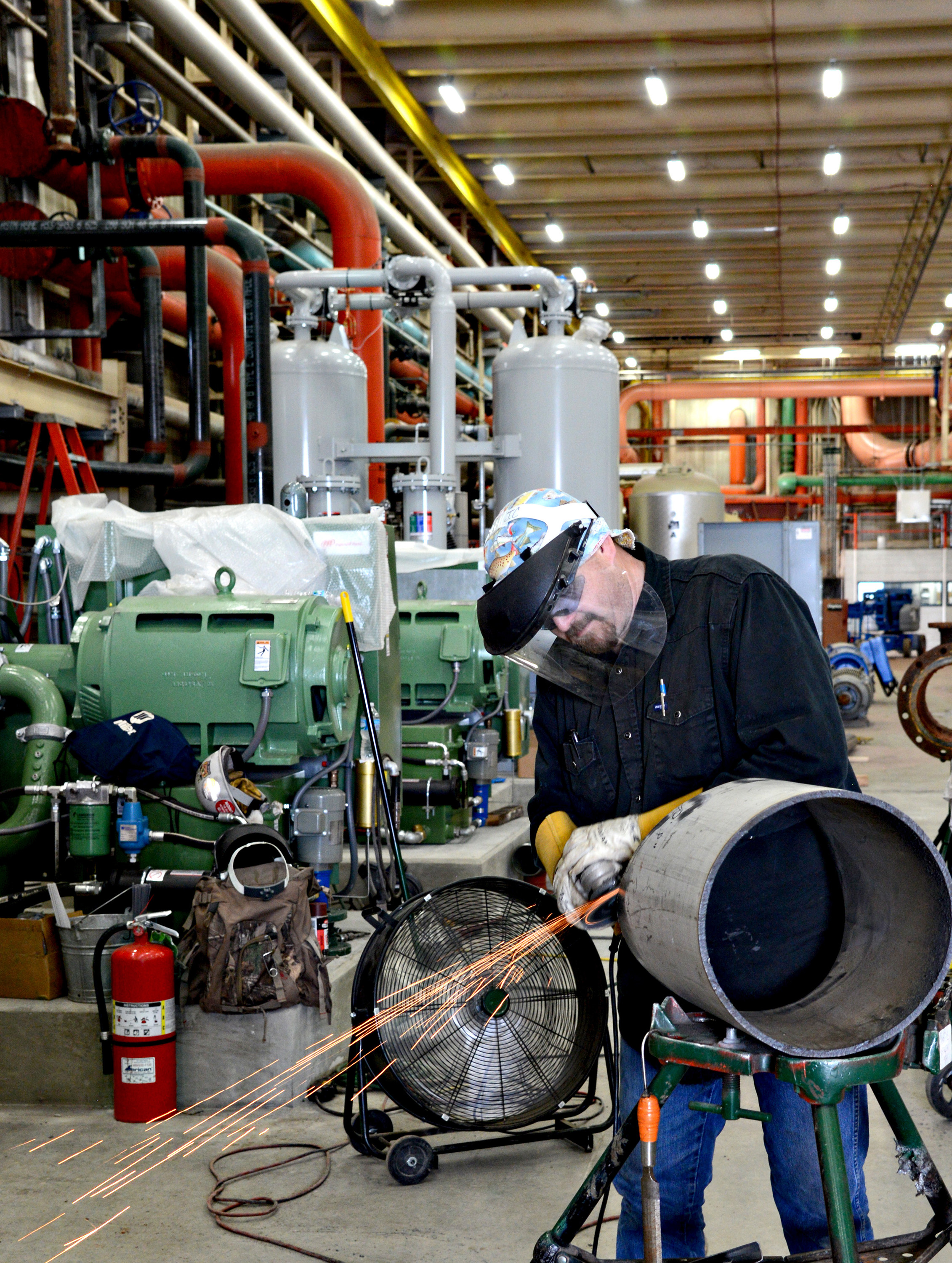 James Conley, a pipe fitter welder with Trade Mechanical, works on parts that will be installed in Bldg. 9301 as part of an energy savings project with Oklahoma Gas & Electric and Honeywell. (Air Force photo by Kelly White)