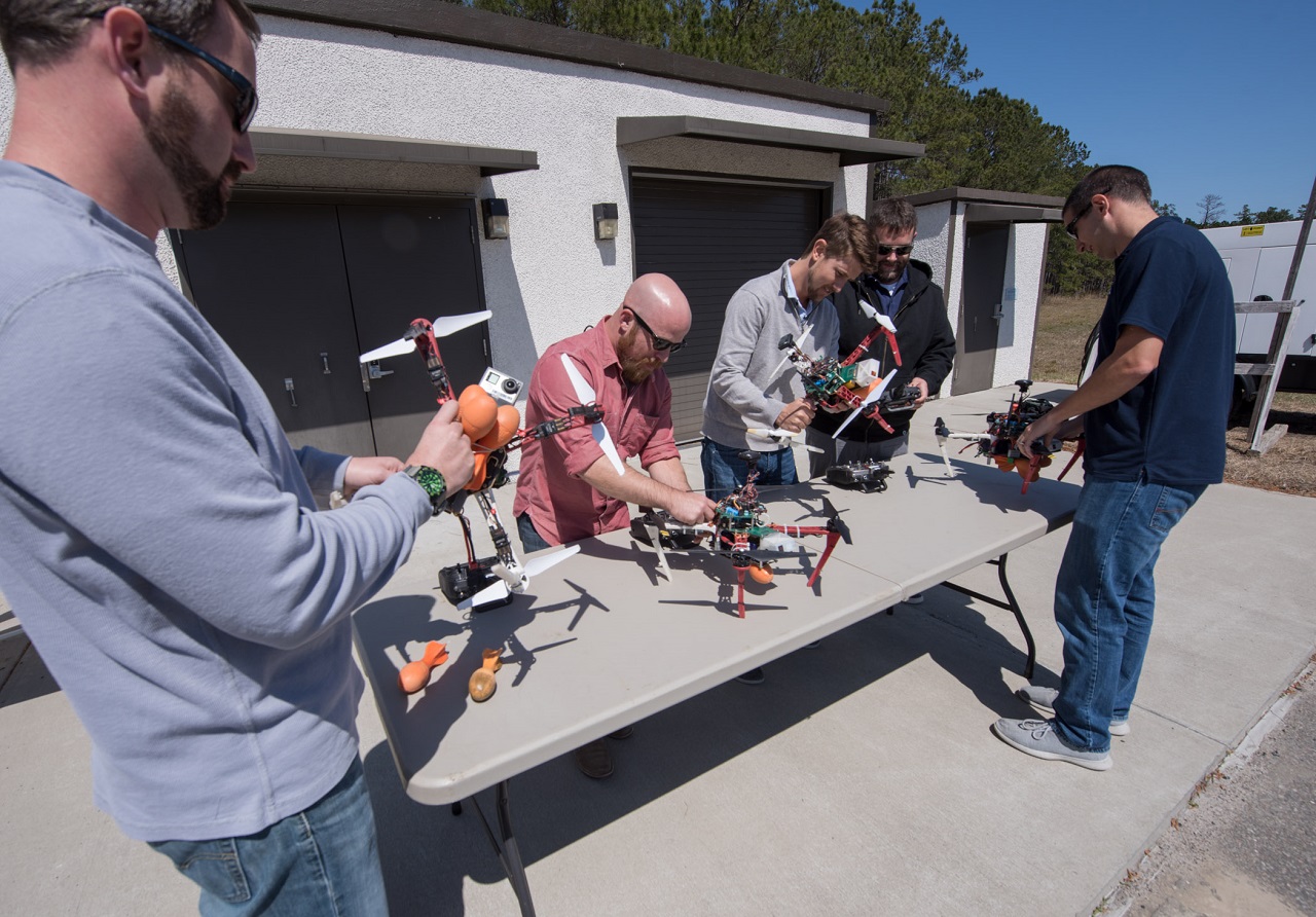 180322-N-GB257-001 Charleston, S.C. Charleston, S.C. (March 22, 2018) Space and Naval Warfare Systems Center (SSC) Atlantic employees Brad Knaus, Richard Kelly, Josh Carter, Chad Sullivan and D.J. Tyree, members of the SSC Atlantic Unmanned Systems Research (SAUSR) Range team, prepare a “swarm” of unmanned aerial vehicle’s (UAVs) for a practice mission. The SAUSR team is working with the Defense Advanced Research Projects Agency (DARPA) to put autonomous technology in the hands of warfighters. SSC Atlantic develops, acquires and provides life cycle support for command, control, communications, computer, intelligence, surveillance and reconnaissance (C4ISR) systems, information technology and space capabilities. A leading-edge Navy engineering center, SSC Atlantic designs, builds, tests, fields and supports many of the finest frontline C4ISR systems in use today, and those being planned for the future. (U.S. Navy photo by Joe Bullinger/Released)